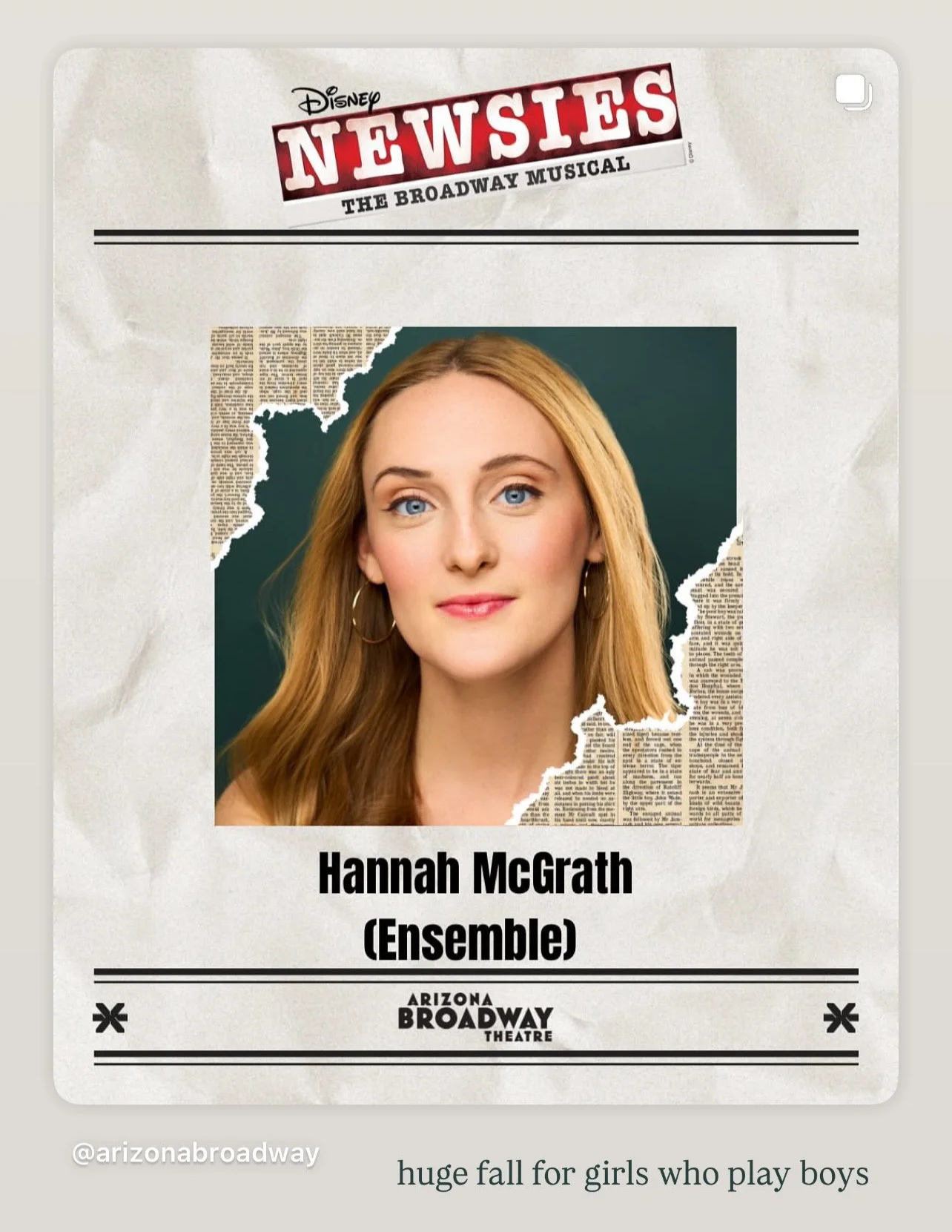 Hannah recently started rehearsals for DISNEY’S NEWSIES at Arizona Broadway Theatre in Peoria, AZ. The production will open on October 3rd and run through November 1st with a special ABT 20th Anniversary performance on November 4th.